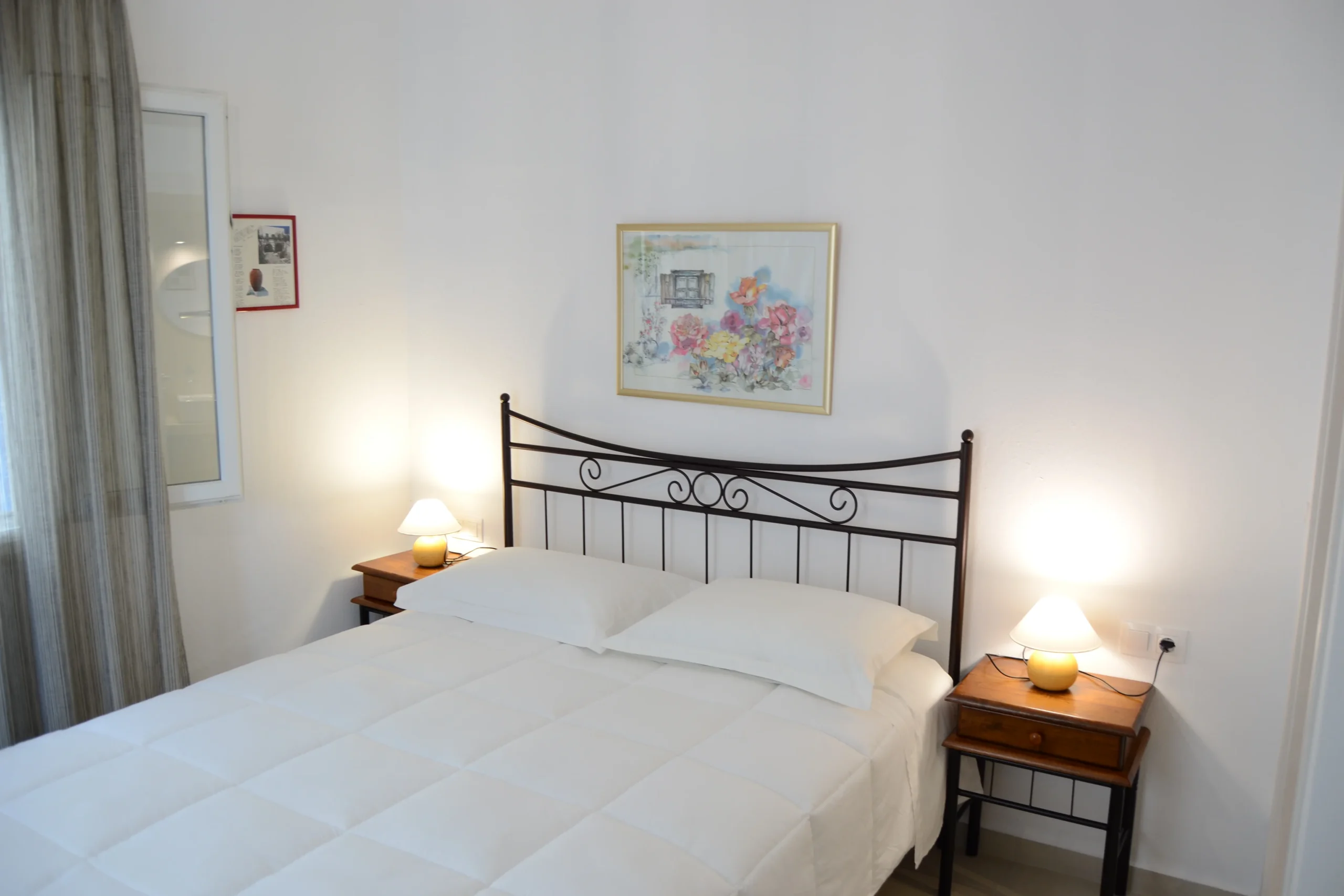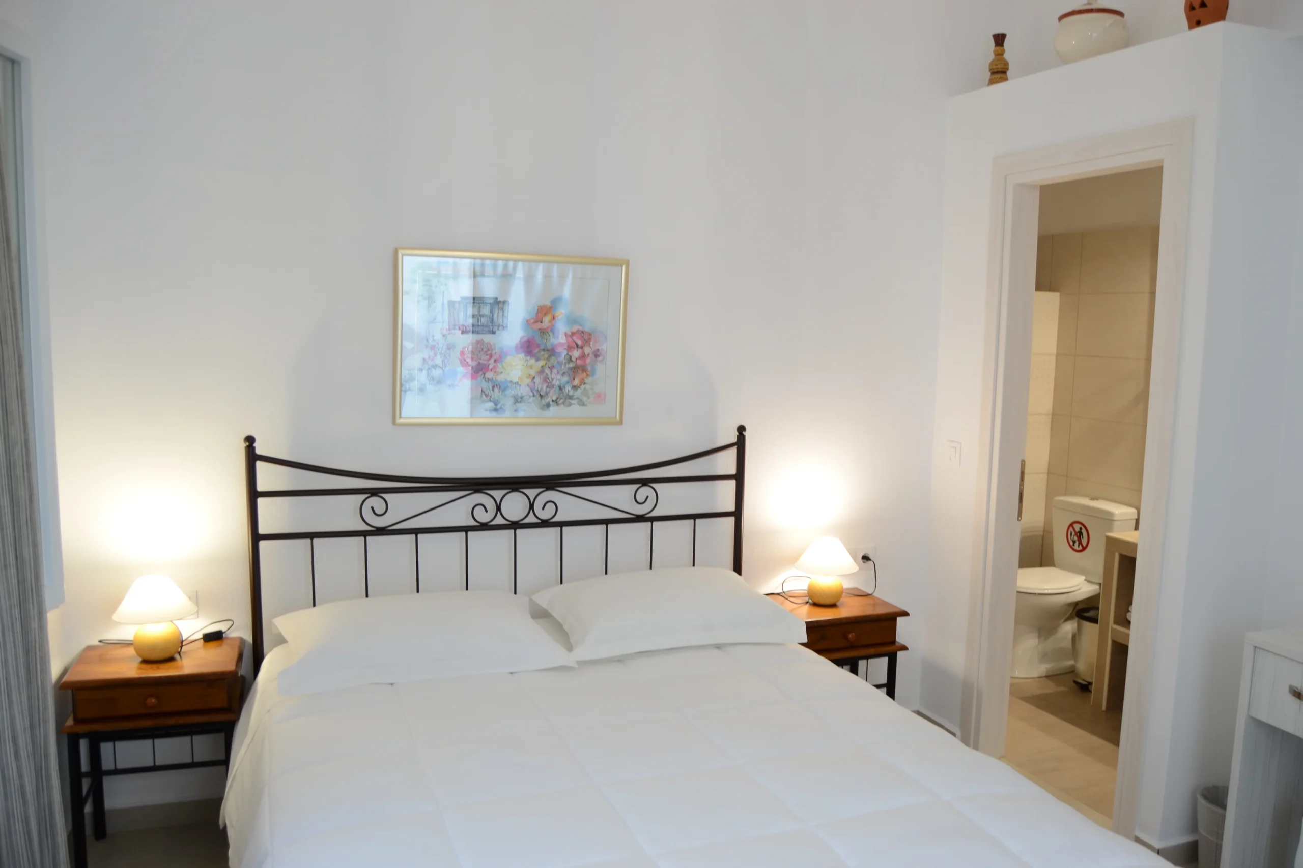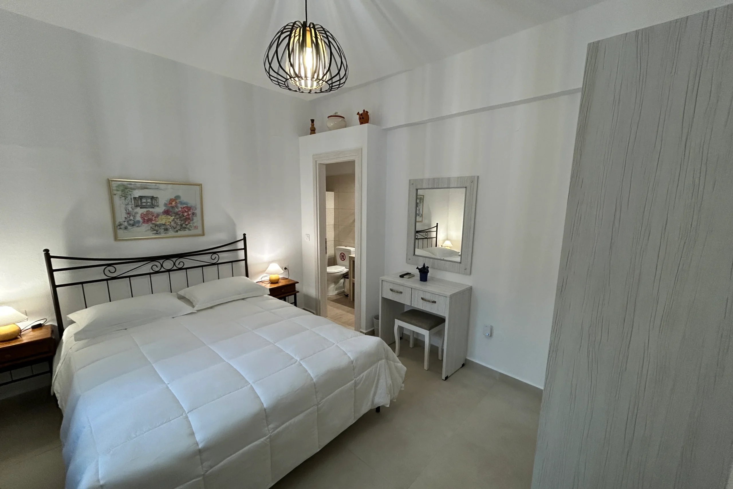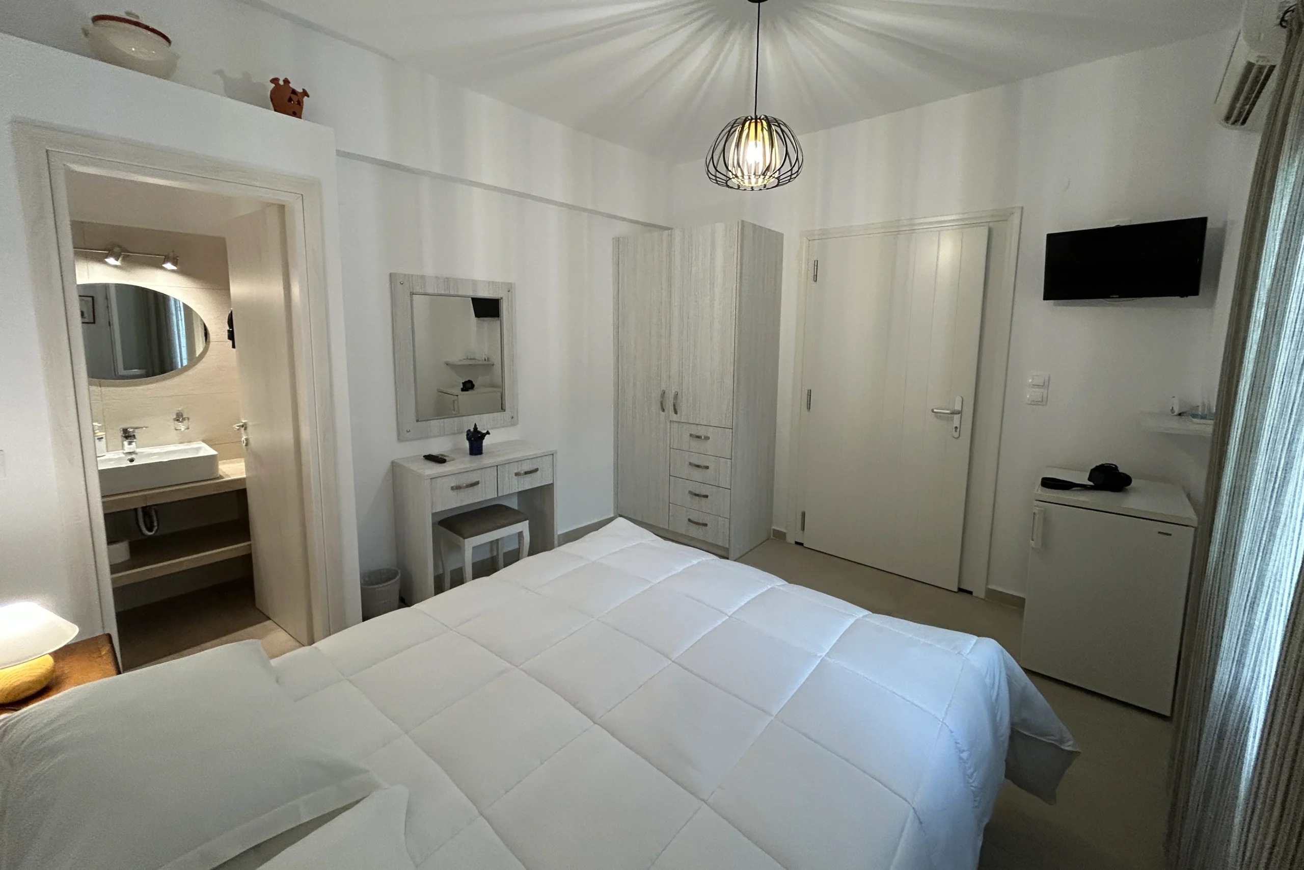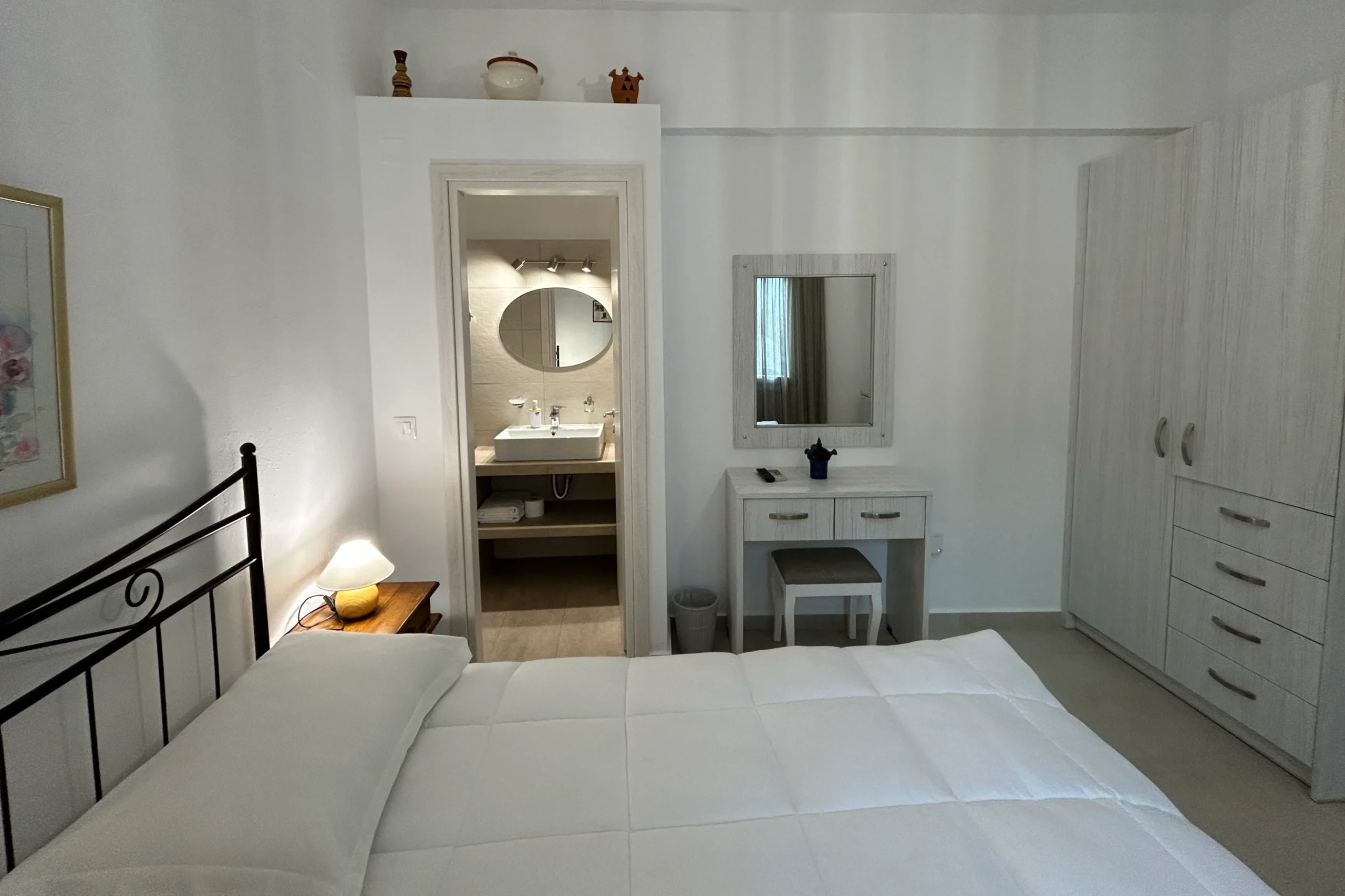 Το δωμάτιο διαθέτει ένα μεγάλο διπλό κρεβάτι, εξασφαλίζοντας ξεκούραστο ύπνο και άνεση για τους επισκέπτες. Τα λευκά είδη και το στρώμα έχουν επιλεγεί με προσοχή, ώστε η εμπειρία ύπνου να είναι ευχάριστη και αναζωογονητική μετά από μια γεμάτη ημέρα στο νησί.