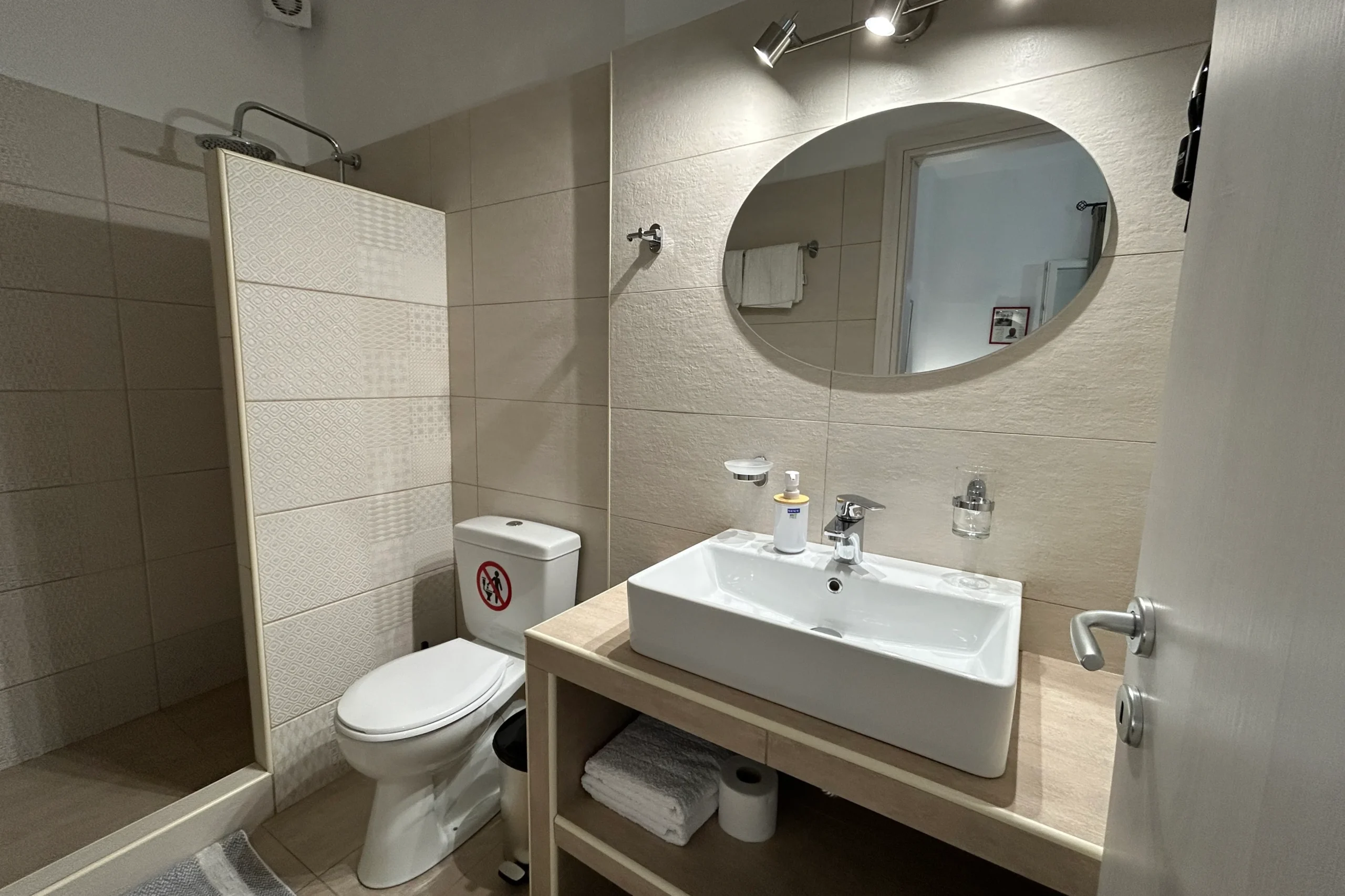 Το ιδιωτικό μπάνιο προσφέρει όλες τις απαραίτητες ανέσεις, όπως ντους, πετσέτες, στεγνωτήρα μαλλιών και δωρεάν προϊόντα περιποίησης. Η πρακτική διαρρύθμιση και η καθαριότητα του χώρου συμβάλλουν σε μια ευχάριστη και λειτουργική εμπειρία, εξασφαλίζοντας άνεση καθ’ όλη τη διάρκεια της διαμονής.