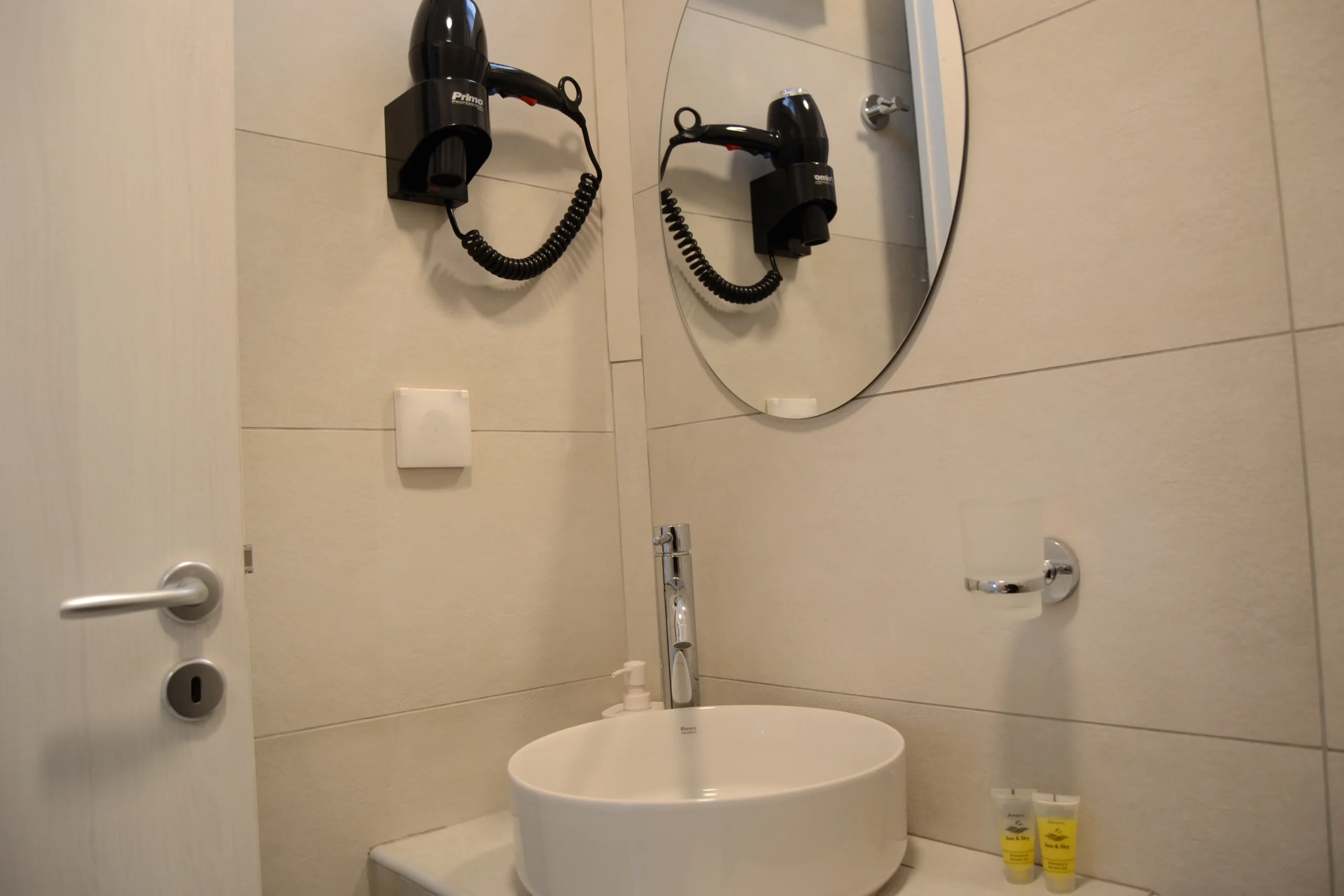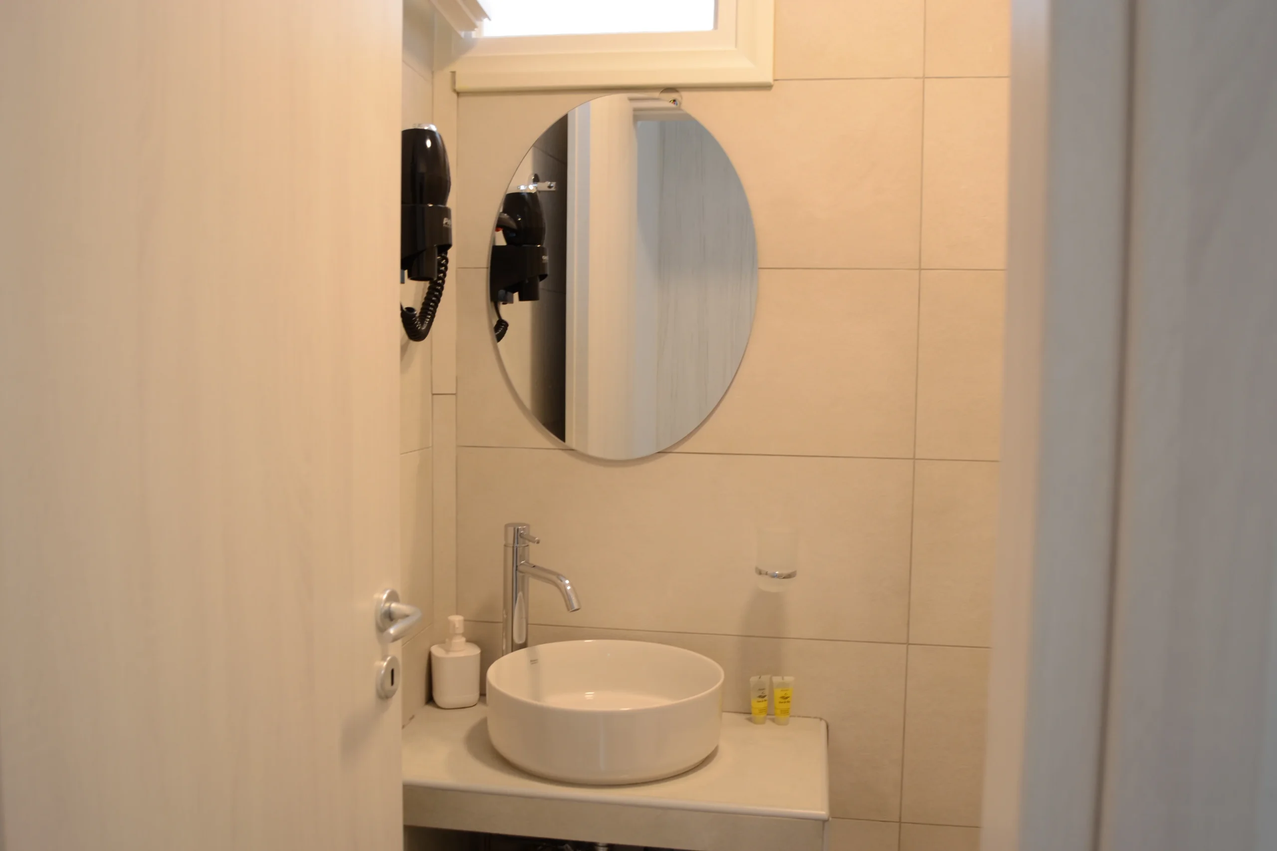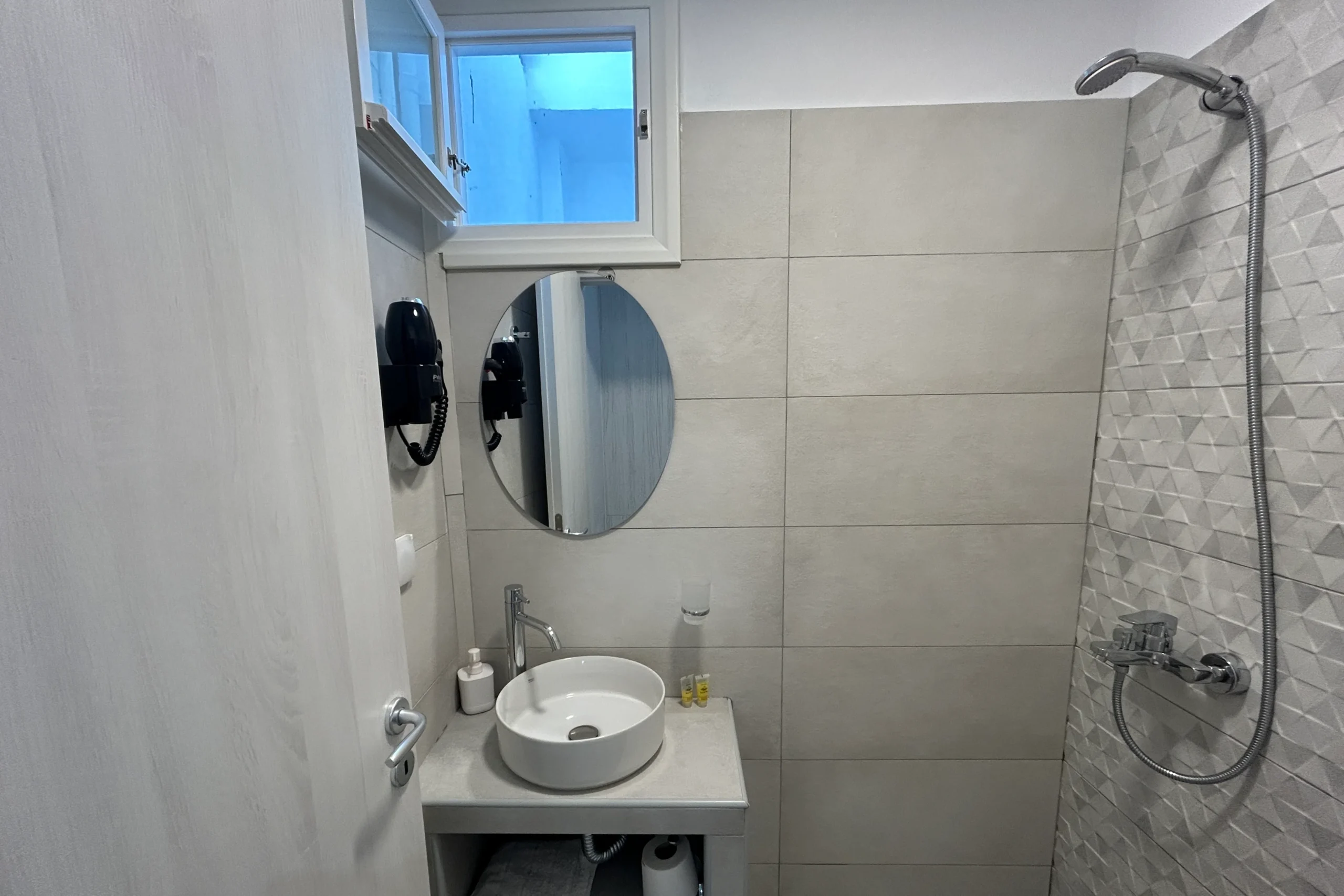 Το ιδιωτικό μπάνιο διαθέτει όλες τις απαραίτητες ανέσεις για άνετη χρήση, όπως ντους, πετσέτες, στεγνωτήρα μαλλιών και δωρεάν προϊόντα περιποίησης. Η καθαριότητα και η πρακτική διάταξη του χώρου εξασφαλίζουν μια άνετη και λειτουργική εμπειρία φιλοξενίας.